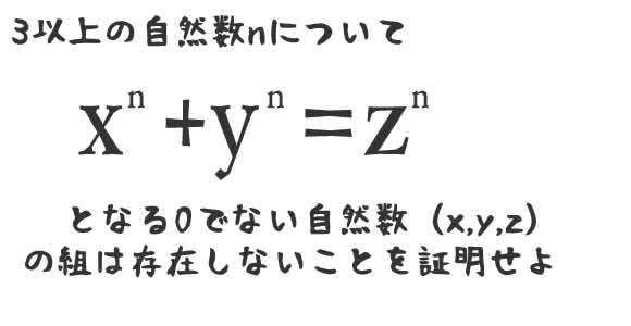 | >>12205 フェルマーの最終定理とは、3 以上の自然数 n について、xn + yn = zn となる自然数の組 (x、 y、 z) は存在しない、という定理のことである。 Cubum autem in duos cubos、 aut quadratoquadratum in duos quadratoquadratos、 et generaliter nullam in infinitum ultra quadratum potestatem in duos eiusdem nominis fas est dividere cuius rei demonstrationem mirabilem sane detexi. Hanc marginis exiguitas non caperet. ![]() [8215] | ||