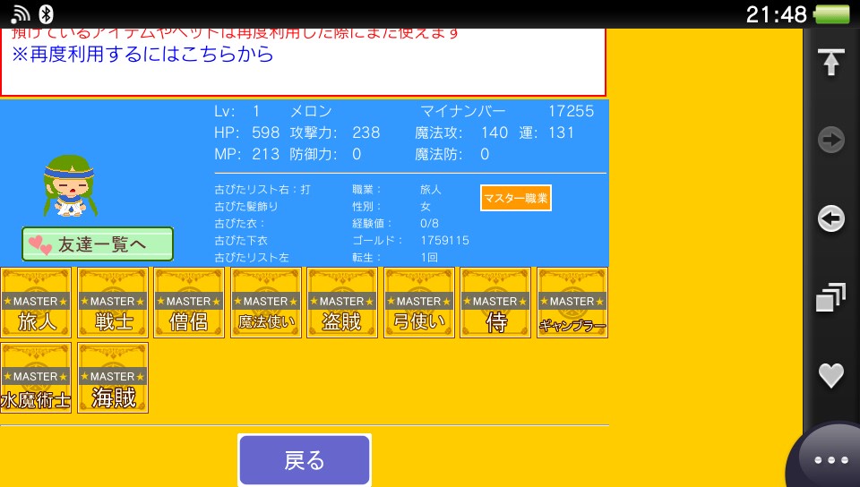 | Lv: 1 メロン マイナンバー 17255 HP: 598 攻撃力: 238 魔法攻: 140 運: 131 MP: 213 防御力: 0 魔法防: 0 古びたリスト右:打 職業: 旅人 送信 古びた髪飾り 性別: 女 古びた衣: 経験値: 0/8 古びた下衣 ゴールド: 1759115 古びたリスト左 転生: 1回 [1684] | ||