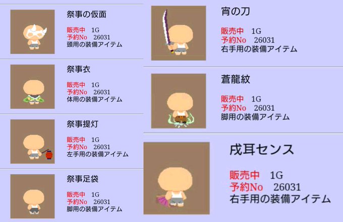 | 求:イベ深×30 出:蒼龍紋 求:イベ深×20 出:祭事1式(右無し) 求:イベ深:7 出:宵の刀 交渉可能、ケーキや倍など混ぜてcp価格下げることも可能 画像参考↓(戌耳センスは売り切れなので関係ないです) ![]() [6643] | ||