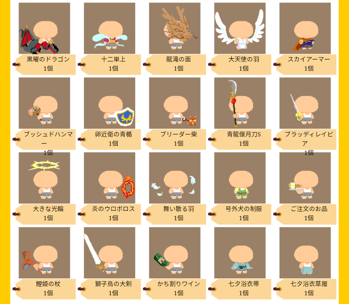 | 画像の物全て単価100cpで売ります(七夕浴衣だけ上下セットで100cp) 欠片2orスキチ2or襟12で100cpの代用可能 現品限りなので売り切れ御免 ![]() [5368] | ||