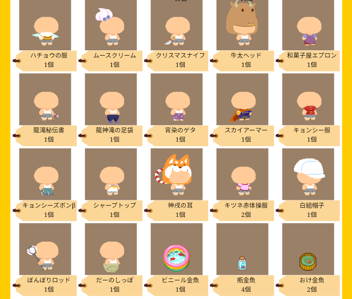| >>12345 神戌の耳、宵闇の下駄、ムースクリーム、牛太、ハチョウの服で買いたいですー [7127] | ||