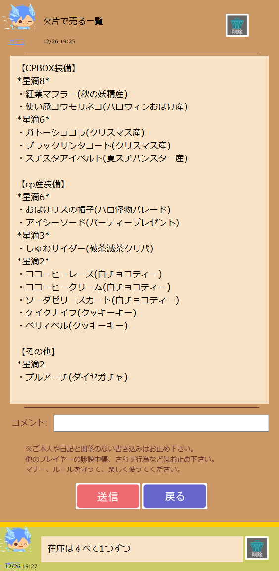 | 出.スノウルフ産装備軽、重、魔一式100個 求.それに見合うもの [2619] | ||