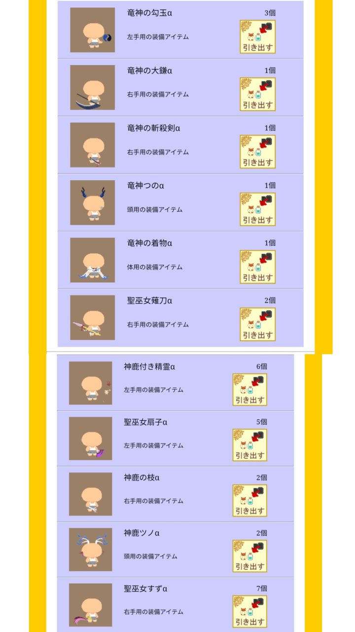 | 出 画像の装備どれか 求 聖巫女装飾αまたは神鹿着物α 聖巫女は2つ、神鹿は3つまで募集してます ![]() [8474] | ||