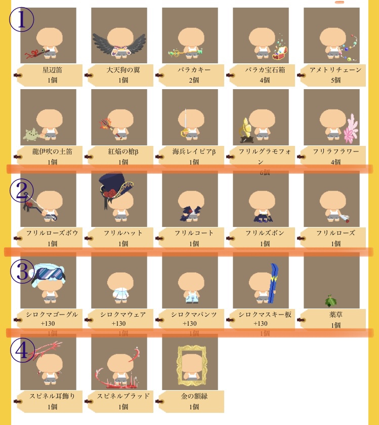 | 下の画像のもの、売ります。指定はすべてクリスマスカードです。 @2個500cp A一式2500cp B一式500cp(薬草は気にしないでください) Cスピネル耳飾り500cp スピネルブラッド1500cp 金の額縁(物理ダメージ確率で半減)500cp ![]() [1515] | ||