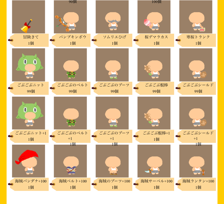 | かぼちゃ弓→200CP おひげ→1000CP 寒桜トランクと桜デマラカス→寒桜のニットか500CP ごぶごぶ未合成99個一式と+1一式→200CP 海賊+100一式→200CP で売りたい CPは100CPの浅ならどこでも ![]() [7546] | ||