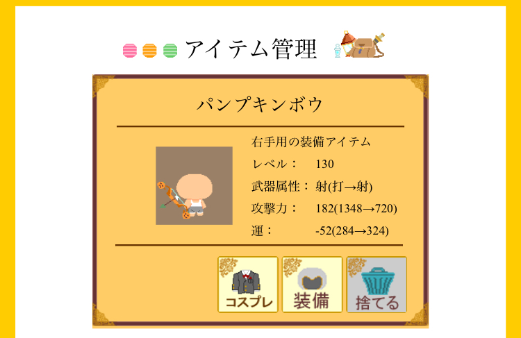 | >>6219 パンプキンボウ 武器属性:射 装備レベル:130 攻撃力:182 運:-52 [7916] | ||