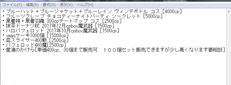 | 出)cpマップ産装備or武器(ランダム) 求)(X’masケーキor襟草)×2 出)3万g 求)X’masケーキor襟草1 [7808] | ||