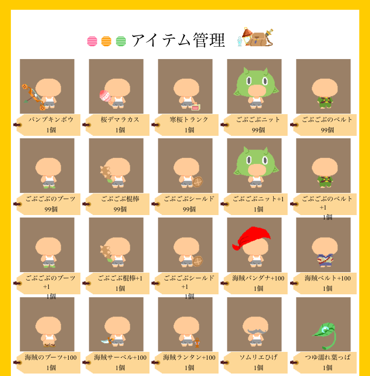 | かぼちゃ弓:200CP 桜デマラカス寒桜トランクセット:500CP又は寒桜のニット ごぶごぶ+1と未合成99個一式:100CP 海賊+100一式:200CP おひげ:1000CP はっぱ:300CP CPは100の浅ならどこでも ![]() [9865] | ||